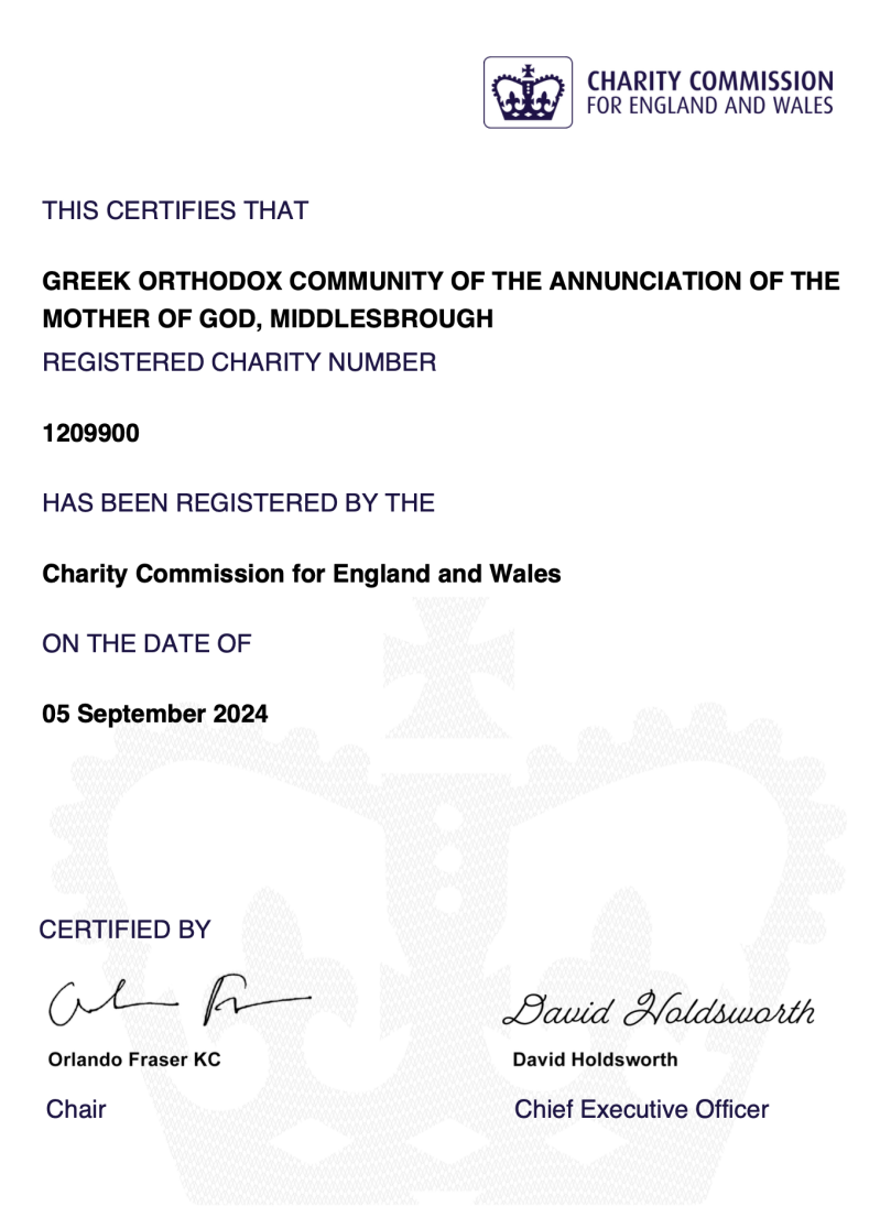 The Greek Orthodox Community of the Annunciation of the Mother of God, Middlesbrough is a charity and it has been entered onto the Register of Charities with the Registered Charity Number 1209900.